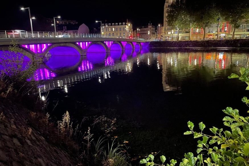 Il est en rose actuellement, mais il pourra aussi s’habiller de bleu, d’orange, courant novembre, de rouge et blanc pour les fêtes, et ponctuellement en bleu-blanc-rouge. Le pont Saint-Pierre a désormais un nouvel éclairage à LEDS.