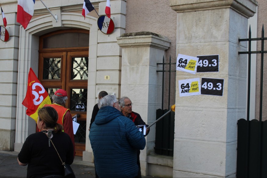 Des affiches noires « 49.3 » collées sur la façade, quelques inscriptions hostiles au projet taggées au sol : les opposants à la réforme des retraites avaient ciblé la sous-préfecture de Montluçon hier soir.