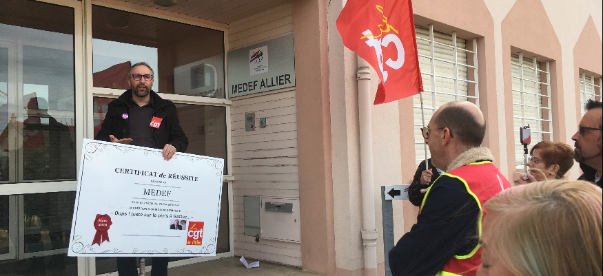 La CGT de l’Allier a un peu anticipé la période des remises de diplômes. Dès hier après-midi, une quinzaine de militants du syndicat se sont réunis devant le siège départemental du MEDEF à Désertines.