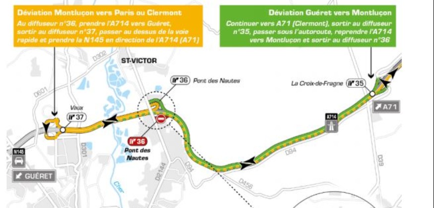 Attention, perturbations à prévoir sur l'A714, la semaine prochaine. Le diffuseur du pont des Nautes à Saint-Victor sera fermé tous les soirs à partir de lundi et jusqu’à jeudi, de 19h30 à 6 heures du matin. La voie de droite sera également neutralisée.