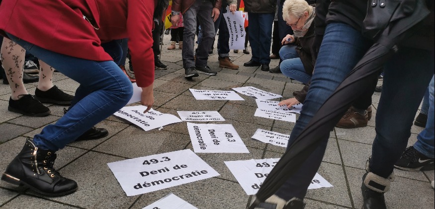 Les manifestants ont laissé une trace de leur passage avec le collage de dizaines d’affiches « 49.3, déni de démocratie » sur le sol place Piquand. Une action qui forcément fait parler…. Mais la secrétaire de l’Union locale CGT Eléna Blond assume.