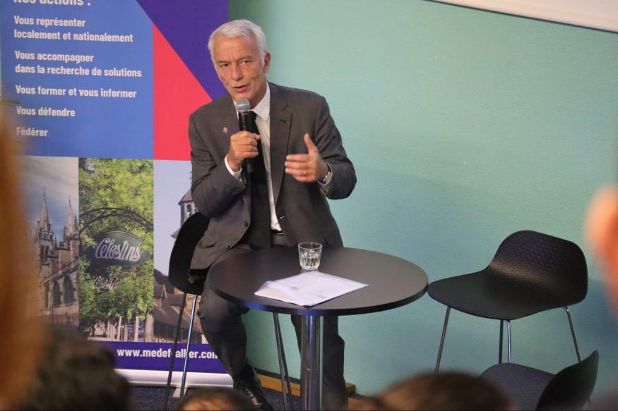 70 chefs d’entreprises bourbonnais présents dans les locaux de la CCI Quai Louis-Blanc pour un temps d’échanges avec celui qui a été élu président national du MEDEF l’été dernier. Malgré les inquiétudes liées à la conjoncture nationale et internationale, ce chef d’une entreprise familiale de l’Ain a appelé les patrons à garder le cap et à rester unis. Il a aussi affiché sa volonté d’être présent dans le débat public pour répondre à ceux, et notamment les militants écologistes, qui ne jurent que par la décroissance pour sauver la planète.