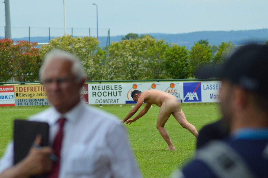 Il faisait sans doute trop chaud pour lui! Un supporter de Macon (Saône-et-Loire) a perpétué la tradition du vrai streaker en apparaissant totalement nu sur le terrain du Stadium de la Loue, hier, à l'occasion de la finale du Challenge Du Manoir de Fédérale 1 qui opposait Macon à Cognac/Saint-Jean d'Angely.