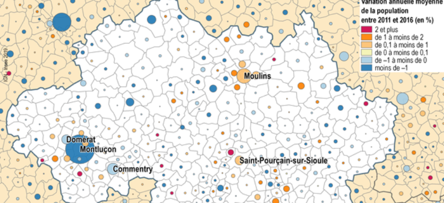 La tendance était connue, elle se confirme : seuls les espaces périurbains (notamment à Vichy et Montluçon) gagnent aujourd'hui de la population. Enfin, l'INSEE note que, pendant que Montluçon perd 400 habitants par an, Moulins en revanche connaît "un taux de croissance de 0,5% par an" grâce à un solde migratoire notable (+0,8%).